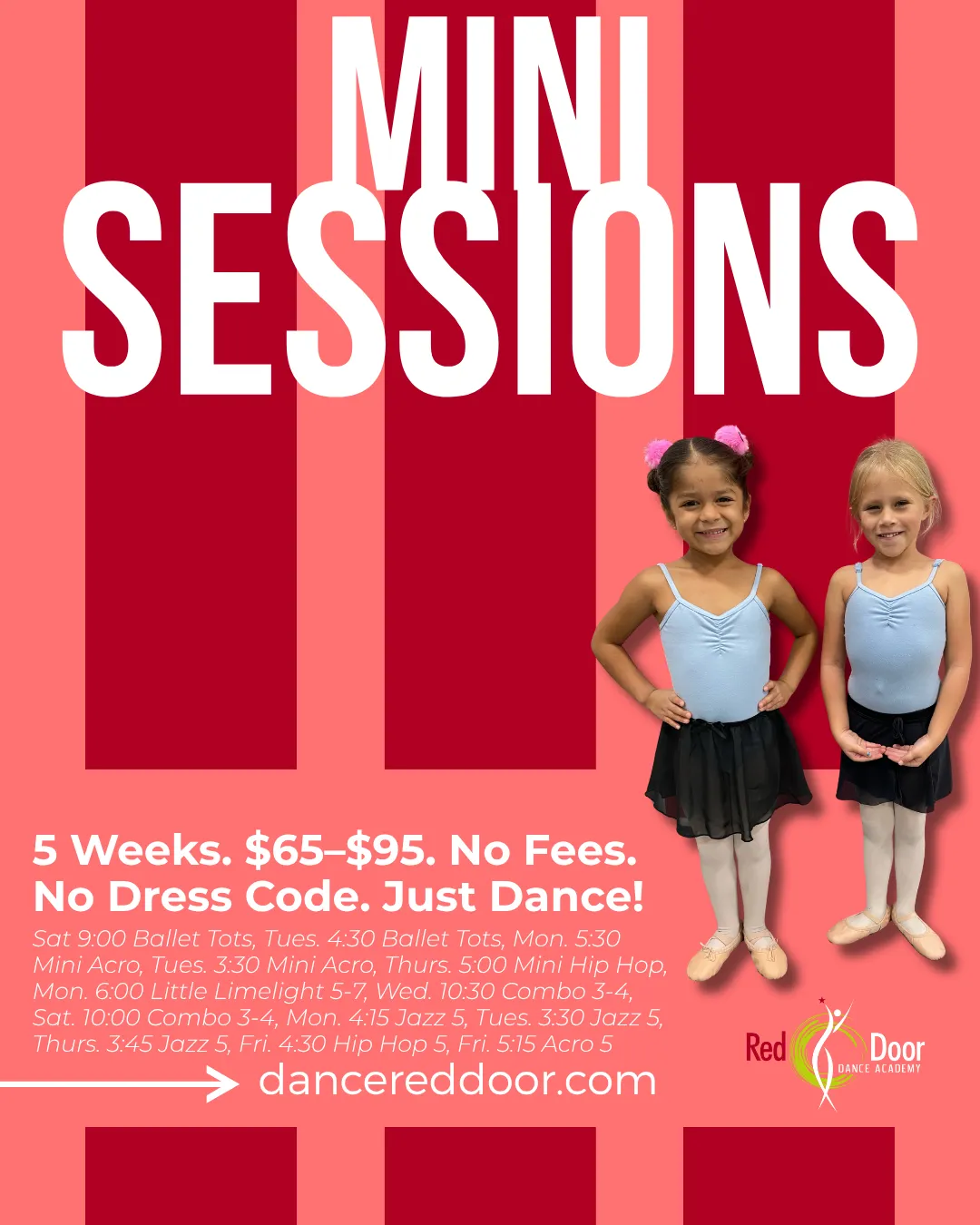 Red Door fan for life!! They literally have college trained dance teachers who actually teach proper poses, turns, etc. It was important to me that my daughter received structured lessons with the correct movements. She blossomed greatly over time and is living the high school drill team dream she has desired. I am so thankful for Red Door, their amazing directors and teachers, their passion and kindness. I will highly recommend them forever.